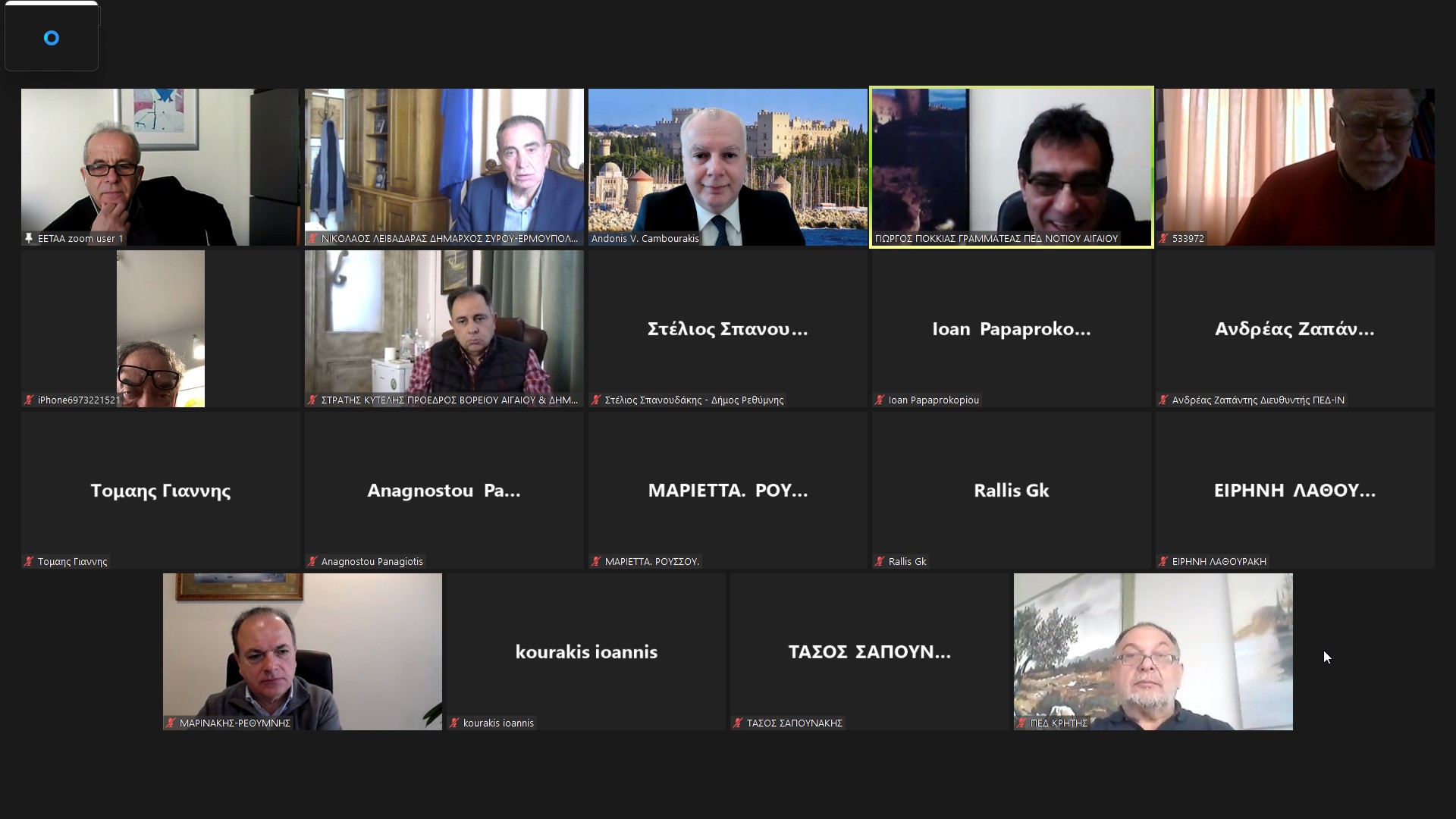 Κοινή συνεδρίαση των Προεδρείων των 4 Νησιωτικών Περιφερειακών Ενώσεων Δήμων (Π.Ε.Δ.) της Χώρας πραγματοποιήθηκε μέσω τηλεδιάσκεψης, με στόχο τον από κοινού συντονισμό δράσεων και ενεργειών για μια σειρά ζητημάτων που αφορούν τους Νησιωτικούς Δήμους.