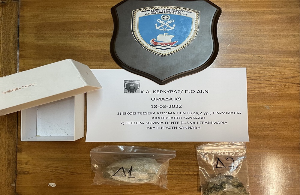 Συγκεκριμένα, κατά τον κατάπλου Ε/Γ-Ο/Γ πλοίου στο νέο λιμένα ν. Κέρκυρας προερχόμενο από το λιμένα Ηγουμενίτσας, διενεργήθηκε έλεγχος από τα εν λόγω στελέχη, με τη συνδρομή του αστυνομικού σκύλου ανίχνευσης ναρκωτικών ουσιών Λ.Σ.-ΕΛ.ΑΚΤ. ”ΣΤΙΤΣ”, στους ανωτέρω και στο Ι.Χ.Ε. όχημά το οποίο οδηγούσε ο 33χρονος, και βρέθηκαν εντός των αποσκευών τους δύο (02) αυτοσχέδιες νάιλον συσκευασίες που περιείχαν ακατέργαστη κάνναβη, συνολικού μεικτού βάρους 28,7γρ.
