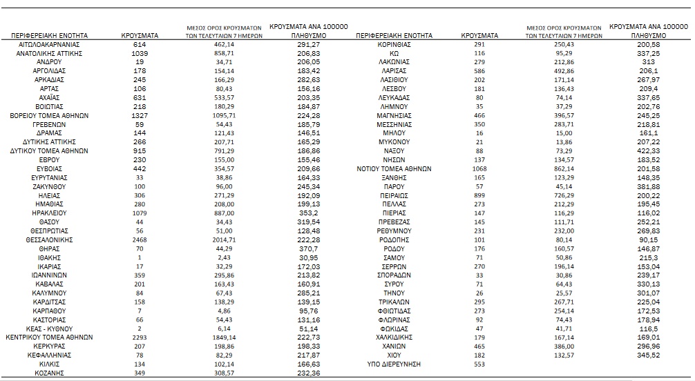 Αναλυτικά, η διασπορά των νέων κρουσμάτων ανά περιφερειακή ενότητα: