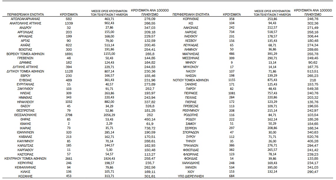 Αναλυτικά, η διασπορά των νέων κρουσμάτων ανά περιφερειακή ενότητα: