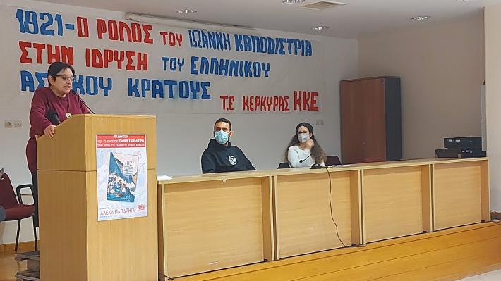 Πλήθος κόσμου από όλη την Κέρκυρα γέμισε την αίθουσα εκδηλώσεων του εργατικού κέντρου της πόλης όπου πραγματοποιήθηκε η εκδήλωση της Τομεακής Επιτροπής Κέρκυρας του ΚΚΕ, με θέμα «1821 ο ρόλος του Ιωάννη Καποδίστρια στην ίδρυση του ελληνικού αστικού κράτους» με ομιλήτρια την Αλέκα Παπαρήγα, μέλος της ΚΕ του ΚΚΕ.