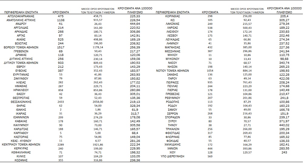 Αναλυτικά, η διασπορά των νέων κρουσμάτων ανά περιφερειακή ενότητα: