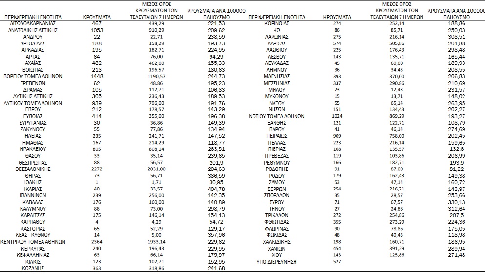 Αναλυτικά, η διασπορά των νέων κρουσμάτων ανά περιφερειακή ενότητα: