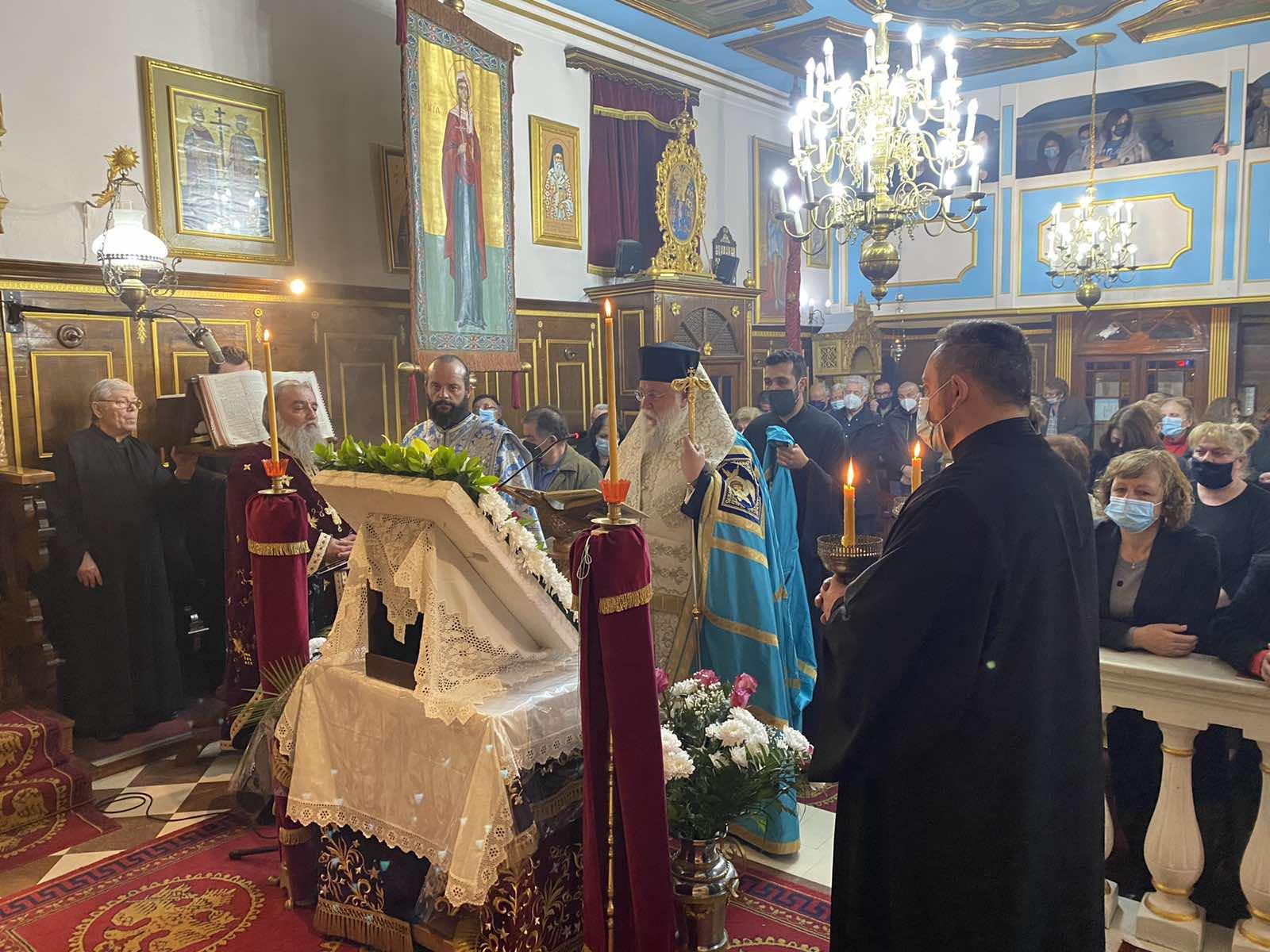 Στο πολυπληθές εκκλησίασμα έλαβε αφορμή ο Σεβασμιώτατος από την στροφήν του οίκου «Ξένον τόκον ἰδόντες, ξενωθῶμεν τοῦ κόσμου, τὸν νοῦν εἰς οὐρανὸν μεταθέντες ». Ένα νέο κεφάλαιο ανοίγει για την ανθρωπότητα η σάρκωση του Υιού και Λόγου του Θεού εκ Πνεύματος Αγίου και εκ Παρθένου Μαρίας. Η σημερινή εορτή του Ευαγγελισμού της Υπεραγίας Θεοτόκου δίδει την δυνατότητα της θεώσεως του ανθρώπου. Οι χαιρετισμοί εις την Παναγία μας έχουν να κάνουν με αυτό το γεγονός του Ευαγγελισμού. Αυτός ο ξένος τόκος που δεν ομοιάζει με όλους τους άλλους τόκους των ανθρώπων, γίνεται οικείος σε μας τους ανθρώπους. Ο Ευαγγελιστής Ιωάννης λέγει ότι οι άνθρωποι δεν παρέλαβαν αυτόν τον ξένον τόκον διότι δεν μπόρεσαν να εκτιμήσουν την θεότητα την οποία ο Ιησούς Χριστός άφηνε σταδιακά να φάνει στην ανθρωπότητα και έρχεται τώρα ο ιερός υμνογράφος για να μας βοηθήσει στην αναγνώριση του Ιησού Χριστού, του ξένου τόκου στην ζωή μας, ότι για να γίνουμε μέτοχοι ξενωθώμεν του κόσμου. Ο σύγχρονος άνθρωπος που είναι συμβεβλημένος με την κοσμική ζωή που σημαίνει το αμαρτωλό φρόνημα του κόσμου, δεν μπορεί να προσεγγίσει την έννοια της αγάπης του Θεού που σαρκώθηκε για την δική μας σωτηρία. Μόνο με την απαλλαγή μας από την εφαμάρτη πραγματικότητα μπορεί ο νους να δεχθεί τον ξένον τόκον και να θεωθεί, τον νουν εις ουρανόν μεταθέντες. Τότε ο νους του ανθρώπου γεμίζει από την παρουσία του Θεού.