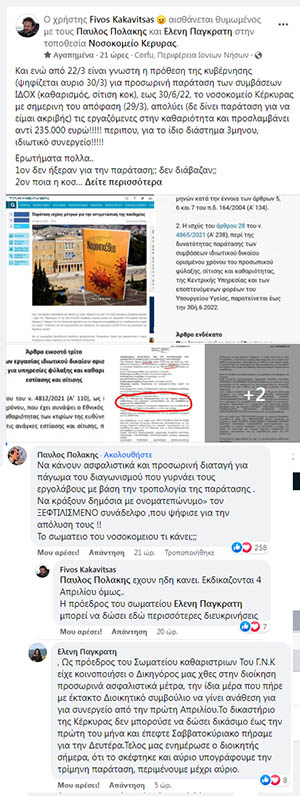 “Και ενώ από 22/3 είναι γνωστή η πρόθεση της κυβέρνησης (ψηφίζεται αύριο 30/3) για προσωρινή παράταση των συμβάσεων ΙΔΟΧ (καθαρισμός, σίτιση κοκ), έως 30/6/22, το νοσοκομείο Κέρκυρας με σημερινή του απόφαση (29/3), απολύει (δε δίνει παράταση για να είμαι ακριβής) τις εργαζόμενες στην καθαριότητα και προσλαμβάνει αντί 235.000 ευρώ(!) περίπου, για το ίδιο διάστημα 3μηνου, ιδιωτικό συνεργείο!!! Ερωτήματα πολλά:
