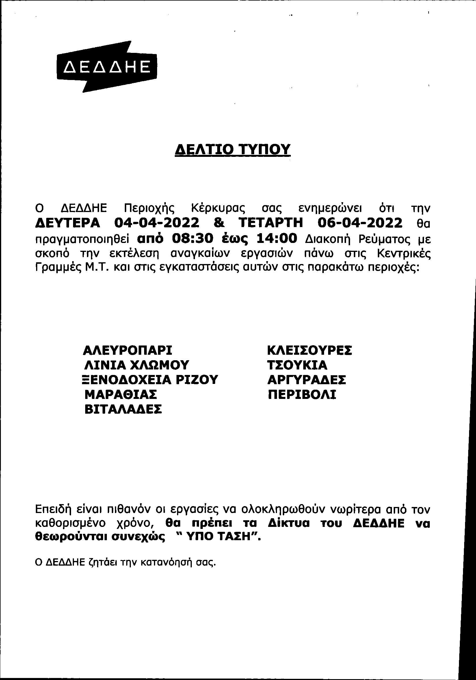 ΚΟΙΝΩΝΙΑΕΛΕΥΘΕΡΟΕΙΔΗΣΕΙΣ Πολύωρες διακοπές ρεύματος στο Νότο την επόμενη εβδομάδα Αιτία των διακοπών θα είναι οι εργασίες που θα πραγματοποιήσει ο ΔΕΔΔΗΕ. Last updated: 01/04/2022 09:11 CorfuPress.com Published: 01/04/2022 Share SHARE Αιτία των διακοπών θα είναι οι εργασίες που θα πραγματοποιήσει ο ΔΕΔΔΗΕ. Διακοπή ρεύματος τη Δευτέρα-Δείτε που Που θα γίνει διακοπή ρεύματος την Τετάρτη Που θα γίνει διακοπή ρεύματος την Τετάρτη Επιστολή Επιμελητηρίου προς ΔΕΔΔΗΕ για τις πολύωρες διακοπές ρεύματος Που θα γίνουν προγραμματισμένες διακοπές ρεύματος το διάστημα 23-25 Αυγούστου Share This Article Facebook Whatsapp Whatsapp Email Copy Link Print Previous Article “Η ακαδημαϊκή δομή των Πανεπιστημίων δεν μπορεί να στηρίζεται σε μονοδιάστατα δεδομένα λειτουργίας” Next Article «Παρεμβάσεις εδώ και τώρα» ζητά ο Μπιάγκης για την αντιμετώπιση του κινδύνου επισιτιστικής κρίσης Δεν υπάρχουν Σχόλια Δεν υπάρχουν Σχόλια Αφήστε μια απάντηση Ακύρωση απάντησηςΗ ηλ. διεύθυνση σας δεν δημοσιεύεται. Τα υποχρεωτικά πεδία σημειώνονται με *Σχόλιο * Όνομα * Email * Ιστότοπος Αποθήκευσε το όνομά μου, email, και τον ιστότοπο μου σε αυτόν τον πλοηγό για την επόμενη φορά που θα σχολιάσω. ΑναζήτησηΑναζήτησηRecent PostsΌλα τα μάτια στον Θοδωρή, τον καπετάνιο μας! Τη Δευτέρα 22 Σεπτεμβρίου γιορτάζει… Σαν Σήμερα 22/9: Τα σημαντικότερα γεγονότα… Η πρόγνωση του καιρού Έφηβοι Ιονίου: Με περίπατο, συνεχίζουν στο Rising Stars! Recent CommentsΧωρίς σχόλια για εμφάνιση.