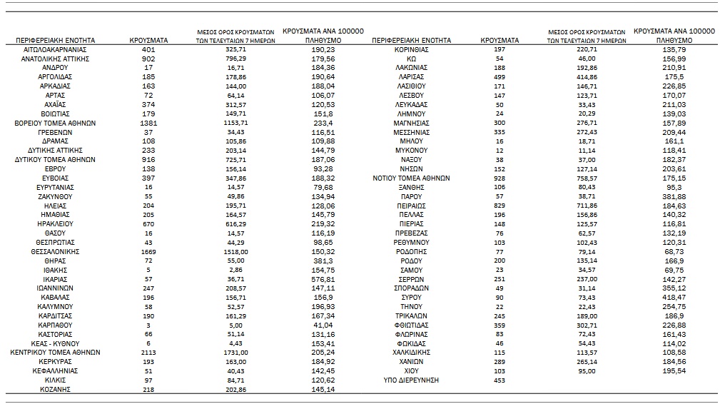 Αναλυτικά, η διασπορά των νέων κρουσμάτων ανά περιφερειακή ενότητα: