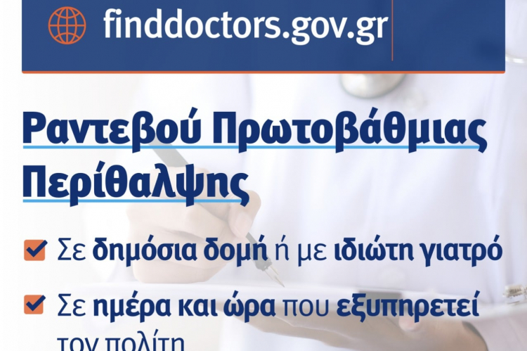 Διαθέσιμο για τους πολίτες είναι από την Τετάρτη το νέο Ψηφιακό Σύστημα Ραντεβού Πολιτών για την Πρωτοβάθμια Περίθαλψη που σχεδιάστηκε από τα Υπουργεία Ψηφιακής Διακυβέρνησης και Υγείας. Πρόκειται για την πλατφόρμα finddoctors.gov.gr που υλοποιήθηκε από την Ηλεκτρονική Διακυβέρνηση Κοινωνικής Ασφάλισης (ΗΔΙΚΑ ΑΕ).