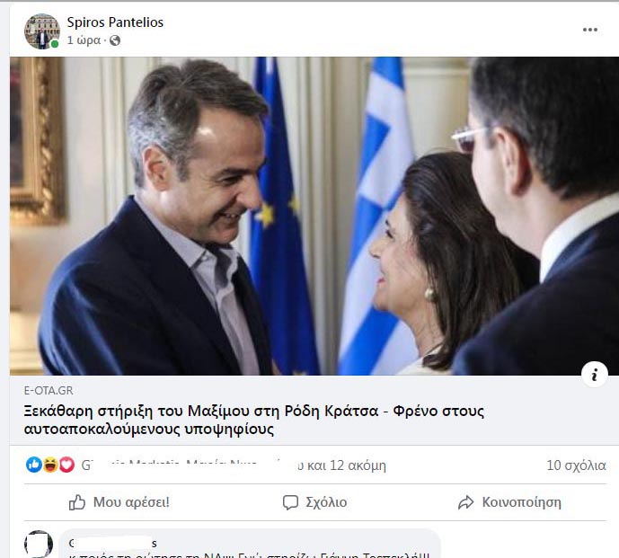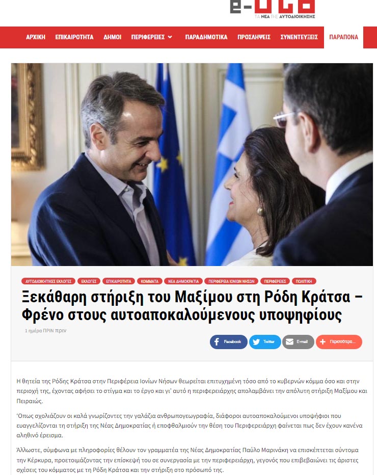 Ο ιστότοπος www.e-ota.gr, ο οποίος τα τελευταία τρία χρόνια καλύπτει θέματα δήμων και περιφερειών με ξεκάθαρη νεοδημοκρατική προσέγγιση, δημοσίευσε κείμενο με τίτλο “ξεκάθαρη στήριξη του Μαξίμου στη Ρόδη Κράτσα – φρένο στους αυτοαποκαλούμενους υποψηφίους” στο οποίο, αφού εκθειάζει τις επιδόσεις της Περιφερειάρχη Ιονίων Νήσων Ρόδης Κράτσα, βάλλει κατά όσων φέρονται, κατά τον ιστότοπο, να διεκδικούν εντός ΝΔ να είναι υποψήφιοι για τη θέση στις επόμενες Αυτοδιοικητικές εκλογές (τέλος της Άνοιξης του 2023).