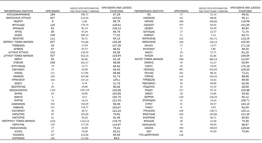 Αναλυτικά, η διασπορά των νέων κρουσμάτων ανά περιφερειακή ενότητα: