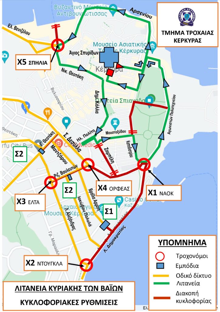 H Διεύθυνση Αστυνομίας Κέρκυρας και το Τμήμα Τροχαίας Κέρκυρας ανακοίνωσε τις κυκλοφοριακές ρυθμίσεις στην Πόλη της Κέρκυρας κατά τη διάρκεια της Λιτάνευσης του σκηνώματος του Αγίου Σπυρίδωνα, την Κυριακή των Βαΐων.