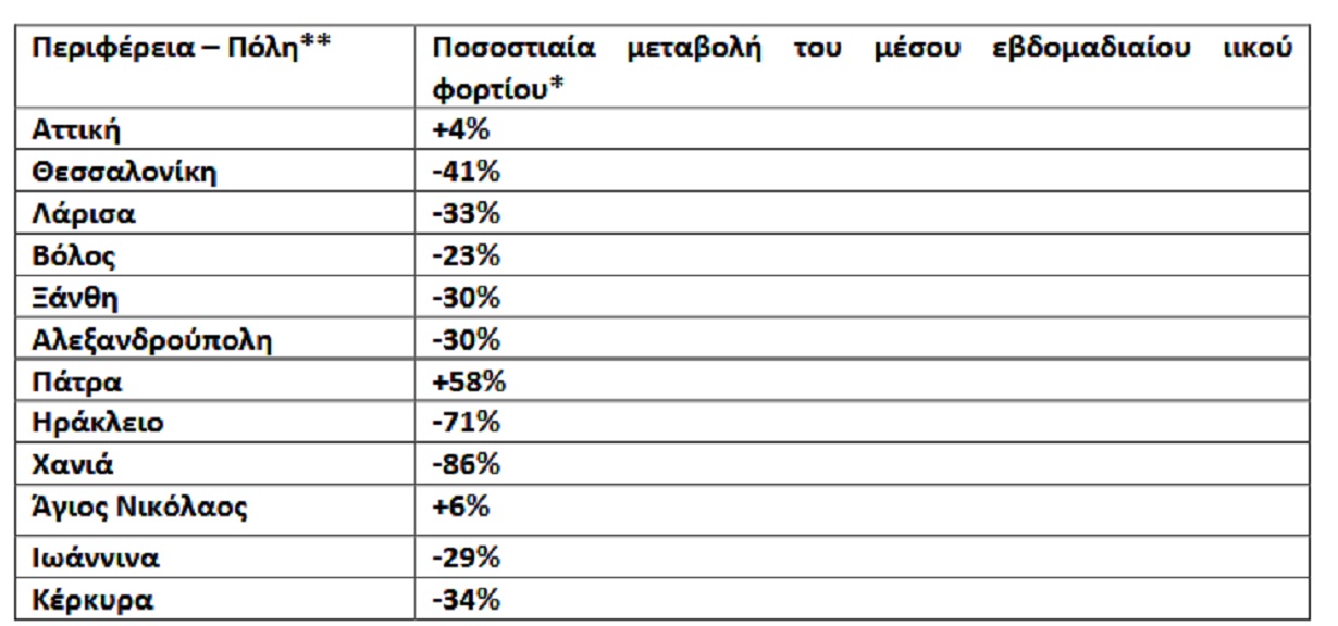 Καθαρά πτωτικές τάσεις παρατηρήθηκαν στα Χανιά (-86%), στο Ηράκλειο (-71%), στη Θεσσαλονίκη (-41%), στην Κέρκυρα (-34%) και στη Λάρισα (-33%), ενώ οριακή ήταν η μείωση στο Βόλο (-23%), στα Ιωάννινα (-29%), στην Ξάνθη(-30%) και στην Αλεξανδρούπολη (-30%).