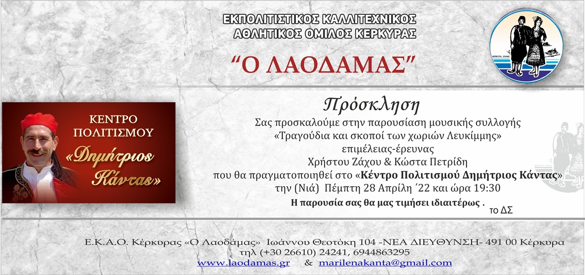 Εκδήλωση παρουσίασης της μουσικής συλλογής “τραγούδια της Λευκίμμης” θα πραγματοποιηθεί την Πέμπτη, στις 7.30 το απόγευμα στη νέα αίθουσα του Λαοδάμαντα (Κέντρο Πολιτισμού “Δημήτριος Κάντας”) στην οδό Ιωάννη Θεοτόκη 104.