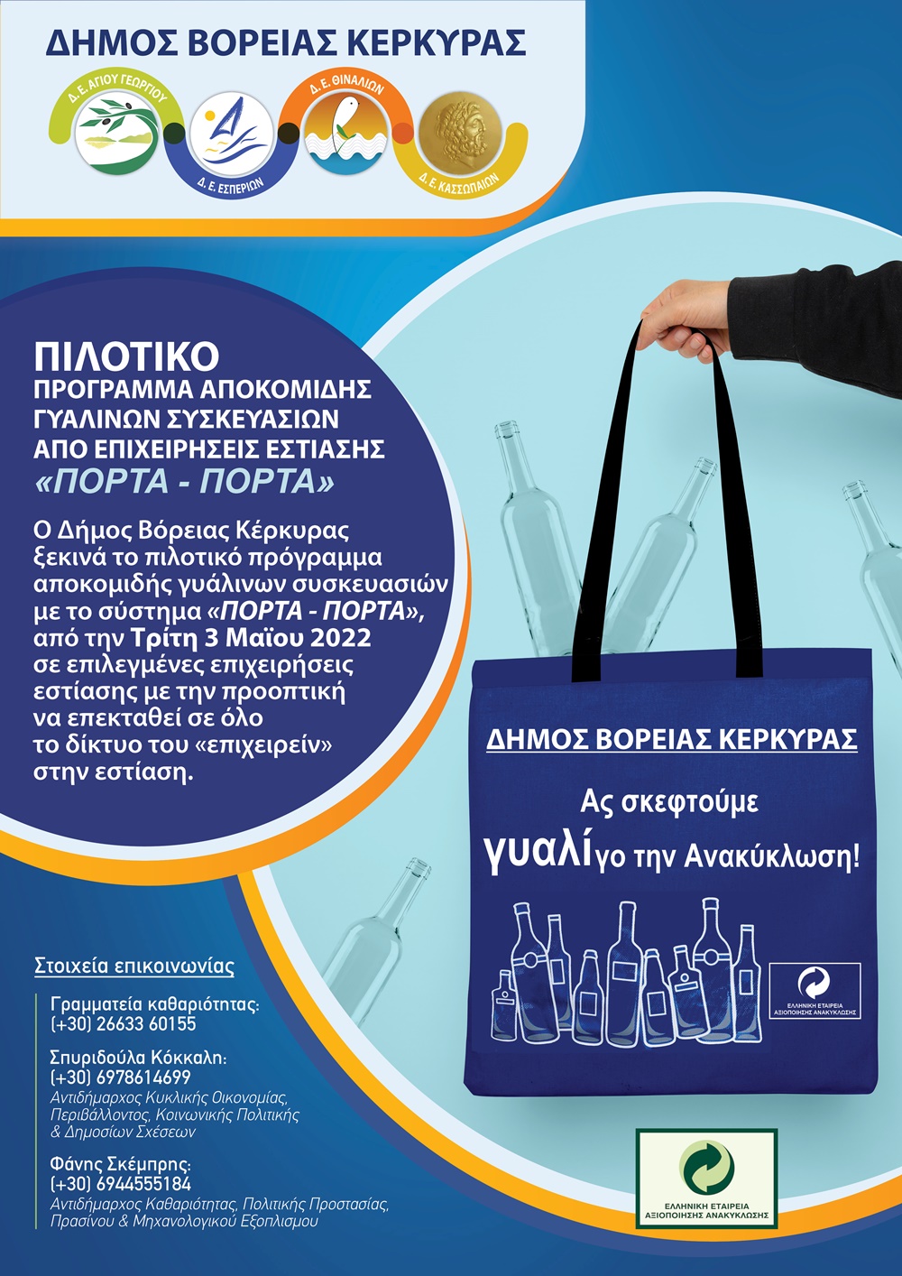 Ο Δήμος Βόρειας Κέρκυρας ξεκινά πιλοτικό πρόγραμμα αποκομιδής γυάλινων συσκευασιών «ΠΟΡΤΑ ΠΟΡΤΑ» σε επιλεγμένες επιχειρήσεις εστίασης με την προοπτική να επεκταθεί σε όλο το δίκτυο του «επιχειρείν» στο συγκεκριμένο τομέα