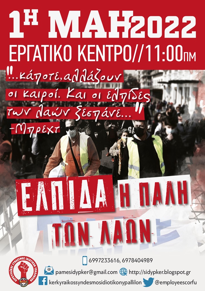 Με σύνθημα “ελπίδα η πάλη των λαών” ο Κερκυραϊκός Σύνδεσμος Ιδιωτικών Υπαλλήλων απευθύνει κάλεσμα στην απεργιακή συγκέντρωση της Πρωτομαγιάς την Κυριακή στις 11 το πρωί στο Εργατικό Κέντρο.