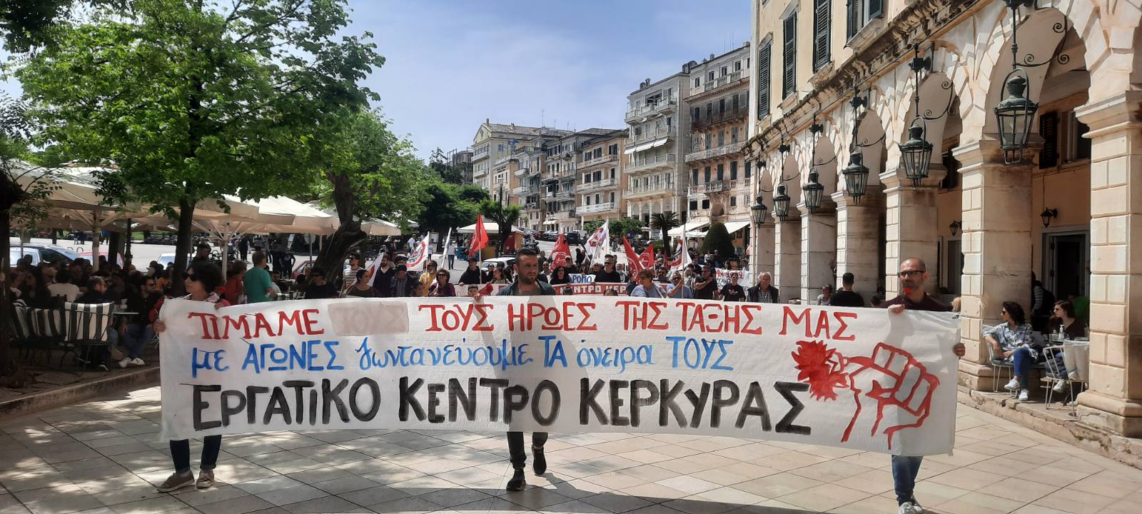 Ακολούθησε πορεία με ένα μεγάλο κόκκινο ποτάμι να πλημμυρίζει τους κεντρικούς δρόμους της πόλης της Κέρκυρας και τα συνθήματα να δονούν την ατμόσφαιρα, όπως “Κόκκινη Πρωτομαγιά πρωτοπόρα εργατιά”, “από το Σικάγο ως την Καισαριανή η ιστορία γράφεται με πάλη ταξική”, “χωρίς εσένα γρανάζι δε γυρνά εργάτη μπορείς χωρίς αφεντικά”, “νόμος είναι το δίκιο του εργάτη και όχι τα κέρδη του κεφαλαιοκράτη”, “τέρμα πια στις αυταπάτες ή με το κεφάλαιο ή με τους εργάτες” κ.ά. Χαρακτηριστική ήταν η εικόνα του κόσμου που από τα πεζοδρόμια, από παράθυρα και μπαλκόνια έβγαινε για να χειροκροτήσει τους διερχόμενους διαδηλωτές!