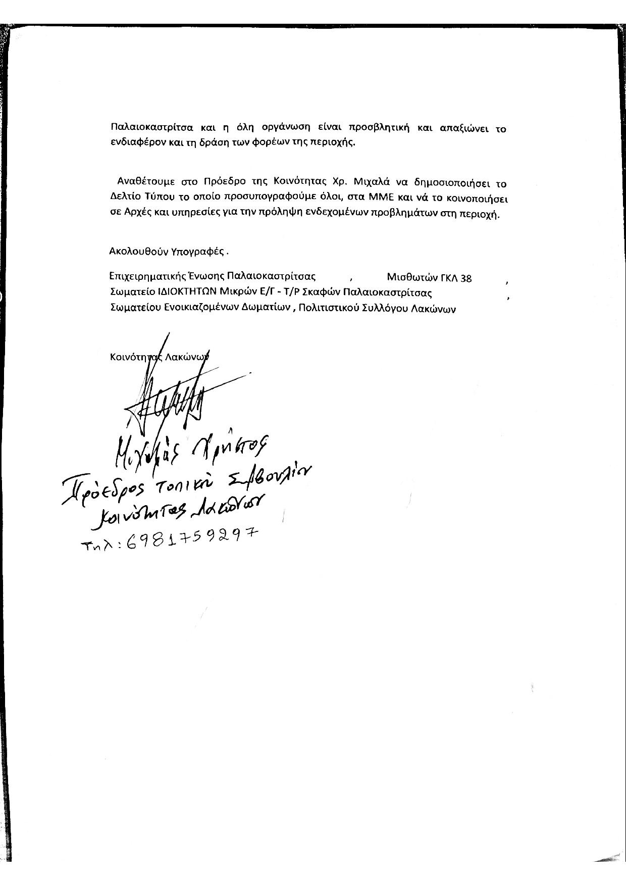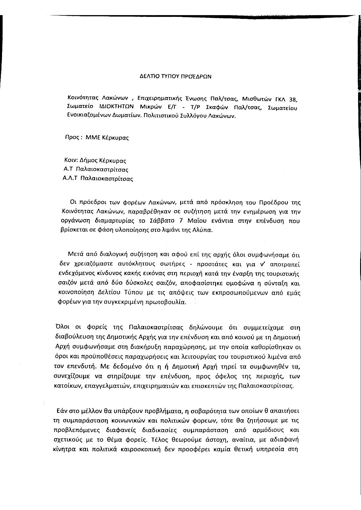 Αντίθετοι στην πρωτοβουλία του Εργατικού Κέντρου και της ΟΑΣΚ για συγκέντρωση διαμαρτυρίας για το λιμάνι της Αλύπας δηλώνουν η κοινότητα των Λακώνων αλλά και φορείς της Παλαιοκαστρίτσας και των Λακώνων.