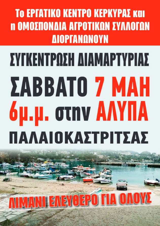 Καλούμε όλες και όλους να δώσουν το αγωνιστικό παρών στην συγκέντρωση διαμαρτυρίας, που οργανώνουμε από κοινού το Εργατικό Κέντρο Κέρκυρας και η Ομοσπονδία Αγροτικών Συλλόγων Κέρκυρας, το Σάββατο 07-05-2022 στις 6μ.μ στην Αλύπα Παλαιοκαστρίτσας.