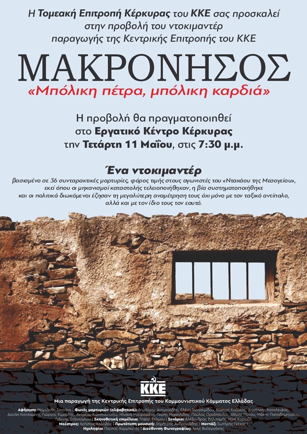 Η Τομεακή Επιτροπή Κέρκυρας του ΚΚΕ πραγματοποιεί εκδηλώσεις – προβολές του ντοκιμαντέρ: ΜΑΚΡΟΝΗΣΟΣ, «Μπόλικη πέτρα, μπόλικη καρδιά».