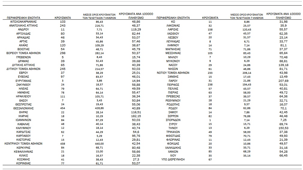 Αναλυτικά, η διασπορά των νέων κρουσμάτων ανά περιφερειακή ενότητα: