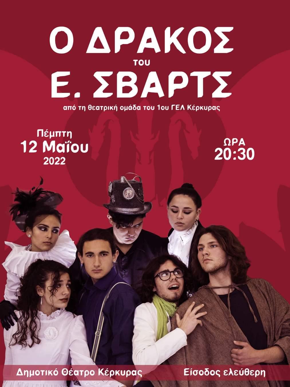 Η θεατρική ομάδα του 1ου Γενικού Λυκείου Κέρκυρας διοργανώνει την παράσταση «Ο Δράκος», του Ε. Σβαρτς που θα πραγματοποιηθεί την Πέμπτη 12 Μαΐου 2022 στις 20:30 στο Δημοτικό Θέατρο Κέρκυρας με ελεύθερη είσοδο.
