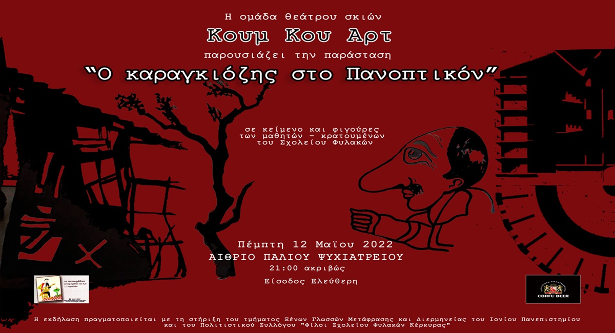 Η ομάδα θεάτρου σκιών Κουμ Κου Art παρουσιάζει την Πέμπτη 12 Μαΐου 2022 στις 21:00 (ακριβώς) στο αίθριο του Παλαιού Ψυχιατρείου (κτίριο Ασκληπιός) την παράσταση “Ο Καραγκιόζης στο Πανοπτικόν”