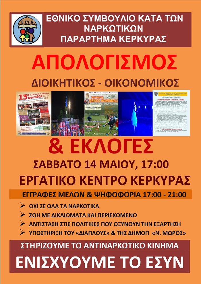 Το Σάββατο 14 Μαΐου θα πραγματοποιηθεί στο Εργατικό Κέντρο στις πέντε το απόγευμα η απολογιστική συνέλευση και οι εκλογές του Παραρτήματος Κέρκυρας του Εθνικού Συμβουλίου Κατά των Ναρκωτικών