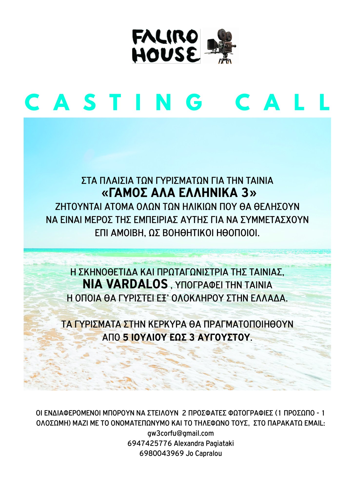 Στο πλαίσιο των γυρισμάτων για την ταινία “Γάμος αλά Ελληνικά 3” ζητούνται άτομα όλων των ηλικιών που θα θελήσουν να είναι μέρος της εμπειρίας αυτής για να συμμετάσχουν επ’ αμοιβή. Ως βοηθητικοί ηθοποιοί.