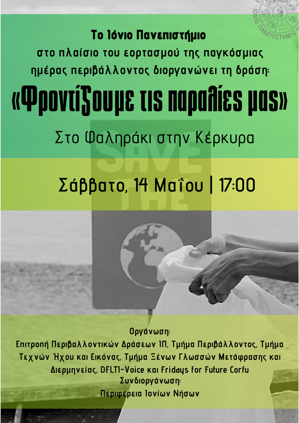 Την οργάνωση της εθελοντικής δράσης «Φροντίζουμε τις παραλίες μας» έχουν αναλάβει οι: Επιτροπή Περιβαλλοντικών Δράσεων του Ιονίου Πανεπιστημίου, Τμήμα Τεχνών Ήχου & Εικόνας, Τμήμα Ξένων Γλωσσών Μετάφρασης & Διερμηνείας, DFLTI – Voice και Fridays for Future Corfu, σε συνδιοργάνωση με την Περιφέρεια Ιονίων Νήσων.