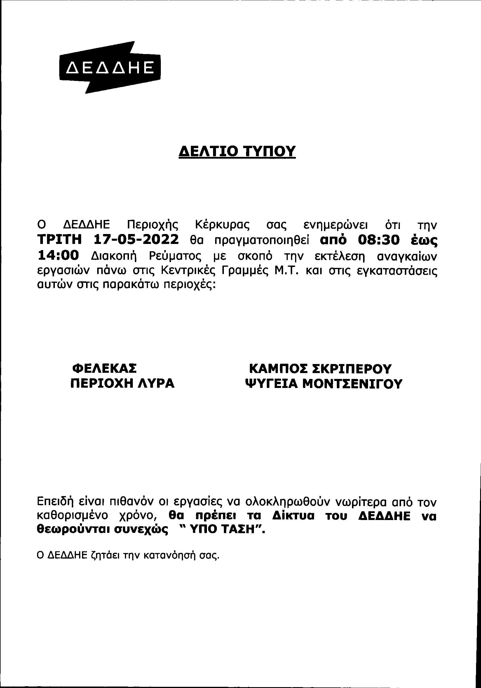 ΚΟΙΝΩΝΙΑΕΛΕΥΘΕΡΟΕΙΔΗΣΕΙΣ Την Τρίτη, νέα διακοπή ρεύματος… Αιτία, οι εργασίες του ΔΕΔΔΗΕ στις κεντρικές γραμμές μεσαίας τάσης. Last updated: 13/05/2022 10:22 CorfuPress.com Published: 13/05/2022 Share SHARE Αιτία, οι εργασίες του ΔΕΔΔΗΕ στις κεντρικές γραμμές μεσαίας τάσης. Έρχεται διακοπή ρεύματος στο Βορρά Έκτακτη διακοπή ρεύματος την Παρασκευή – Δείτε που Διακοπή ρεύματος την Τετάρτη, δείτε που Τρίωρη διακοπή ρεύματος την Κυριακή Τη Δευτέρα, διακοπή ρεύματος στο βορρά Share This Article Facebook Whatsapp Whatsapp Email Copy Link Print Previous Article Ικανοποίηση Κροκίδη για τον εφοδιασμό των Οθωνών με υγρά καύσιμα Next Article Κέρκυρα: 37 πρόστιμα για παραβίαση αντικαπνιστικής νομοθεσίας Δεν υπάρχουν Σχόλια Δεν υπάρχουν Σχόλια Αφήστε μια απάντηση Ακύρωση απάντησηςΗ ηλ. διεύθυνση σας δεν δημοσιεύεται. Τα υποχρεωτικά πεδία σημειώνονται με *Σχόλιο * Όνομα * Email * Ιστότοπος Αποθήκευσε το όνομά μου, email, και τον ιστότοπο μου σε αυτόν τον πλοηγό για την επόμενη φορά που θα σχολιάσω. ΑναζήτησηΑναζήτησηRecent PostsΌλα τα μάτια στον Θοδωρή, τον καπετάνιο μας! Τη Δευτέρα 22 Σεπτεμβρίου γιορτάζει… Σαν Σήμερα 22/9: Τα σημαντικότερα γεγονότα… Η πρόγνωση του καιρού Έφηβοι Ιονίου: Με περίπατο, συνεχίζουν στο Rising Stars! Recent CommentsΧωρίς σχόλια για εμφάνιση.