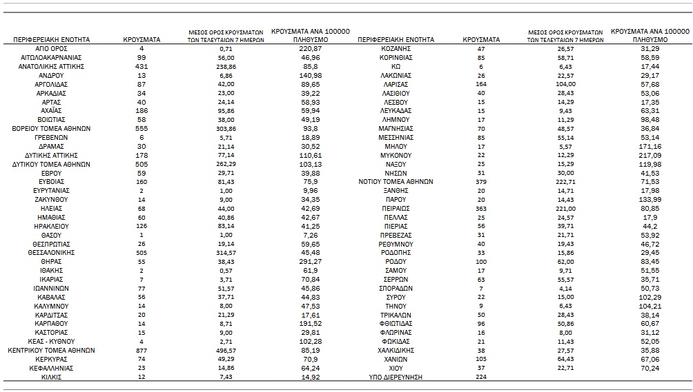 Αναλυτικά, η διασπορά των νέων κρουσμάτων ανά περιφερειακή ενότητα: