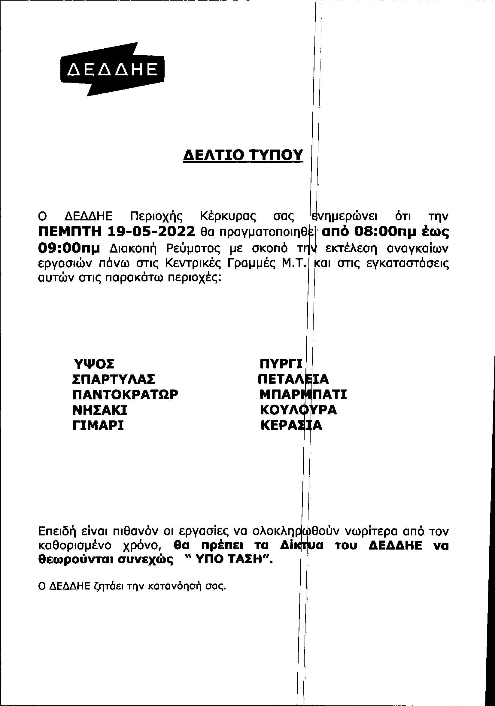 Η διακοπή θα είναι διάρκειας μιας ώρας και θα γίνει λόγω εργασιών του ΔΕΔΔΗΕ πάνω στις κεντρικές γραμμές μεσαίας τάσης.