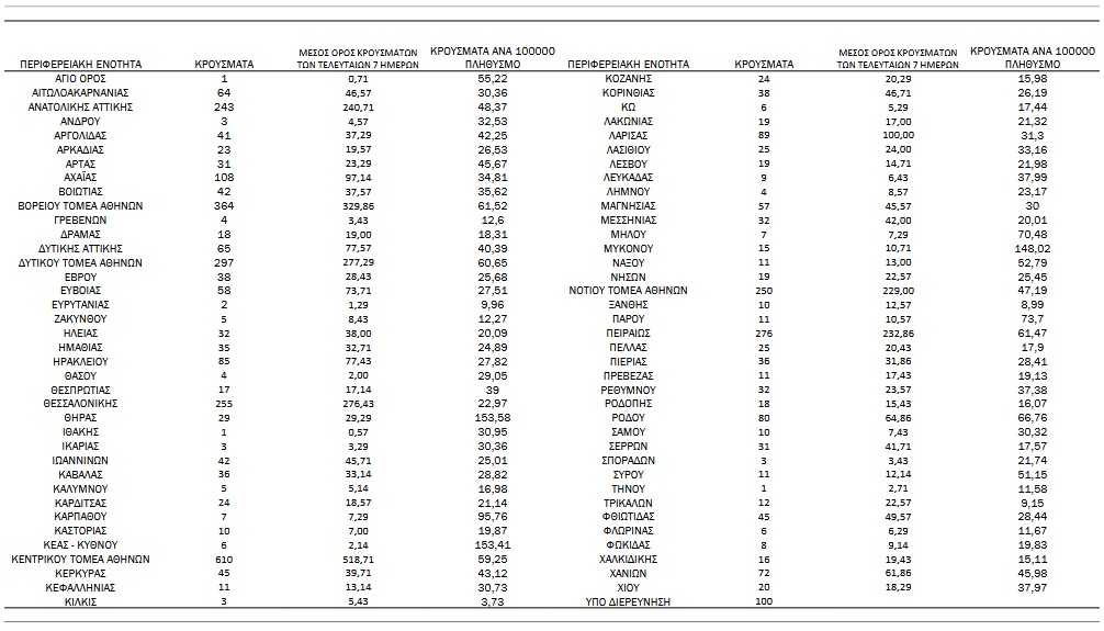 Αναλυτικά, η διασπορά των νέων κρουσμάτων ανά περιφερειακή ενότητα: