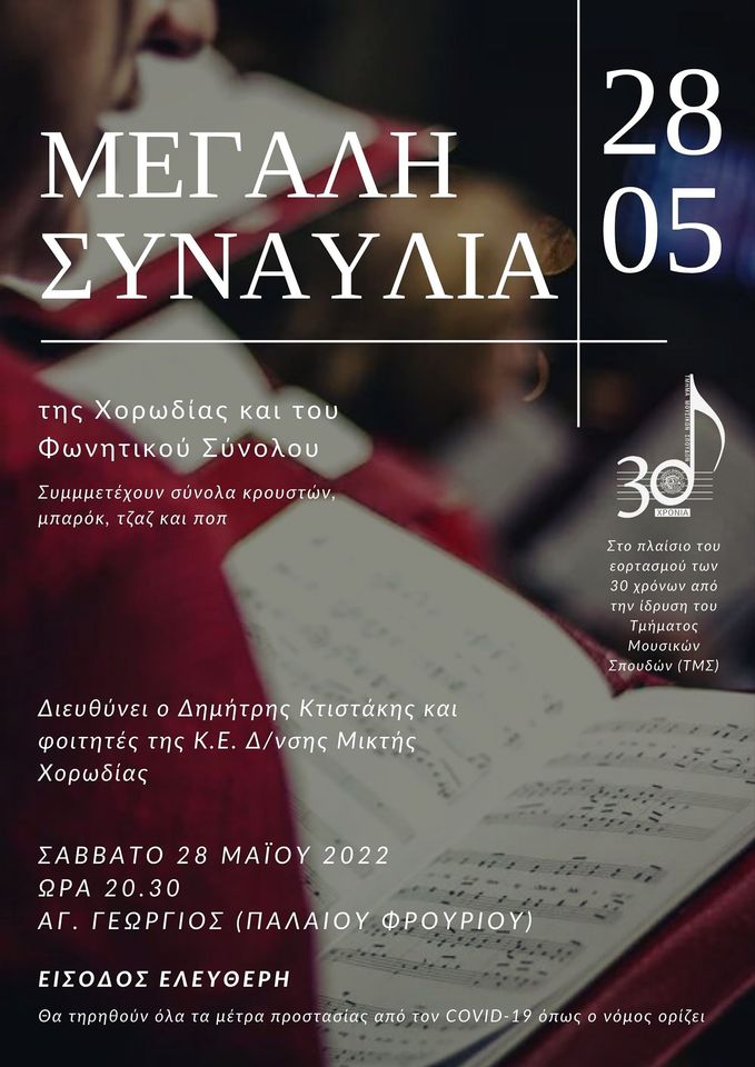 Μια μεγάλη εορταστική συναυλία για τα 30 χρόνια από την ίδρυση του Τμήματος Μουσικών Σπουδών του Ιονίου Πανεπιστημίου θα πραγματοποιήσει η χορωδία και το Φωνητικό Σύνολο του ΤΜΣ στις 28 Μαΐου στον Άγιο Γεώργιο του Παλαιού Φρουρίου Κέρκυρας στις 8.30μμ.