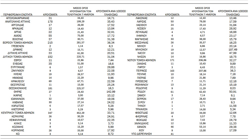 Αναλυτικά, η διασπορά των νέων κρουσμάτων ανά περιφερειακή ενότητα: