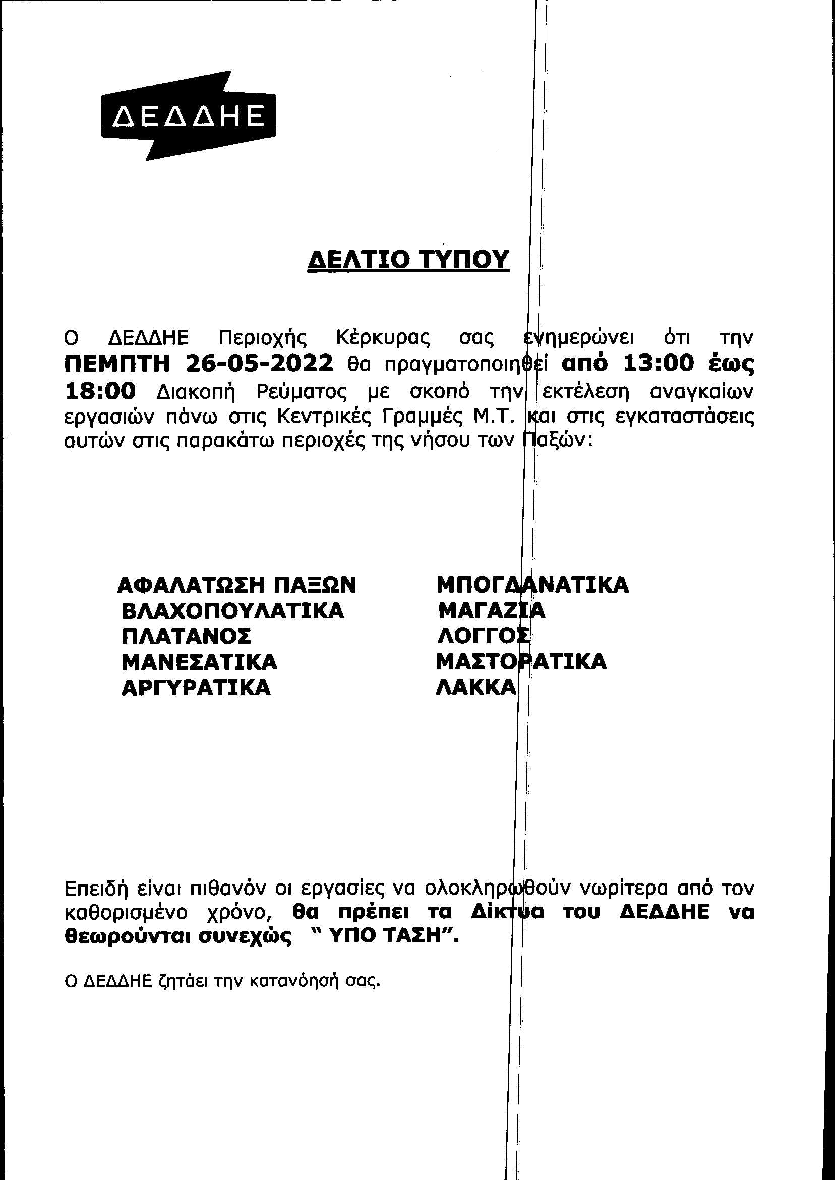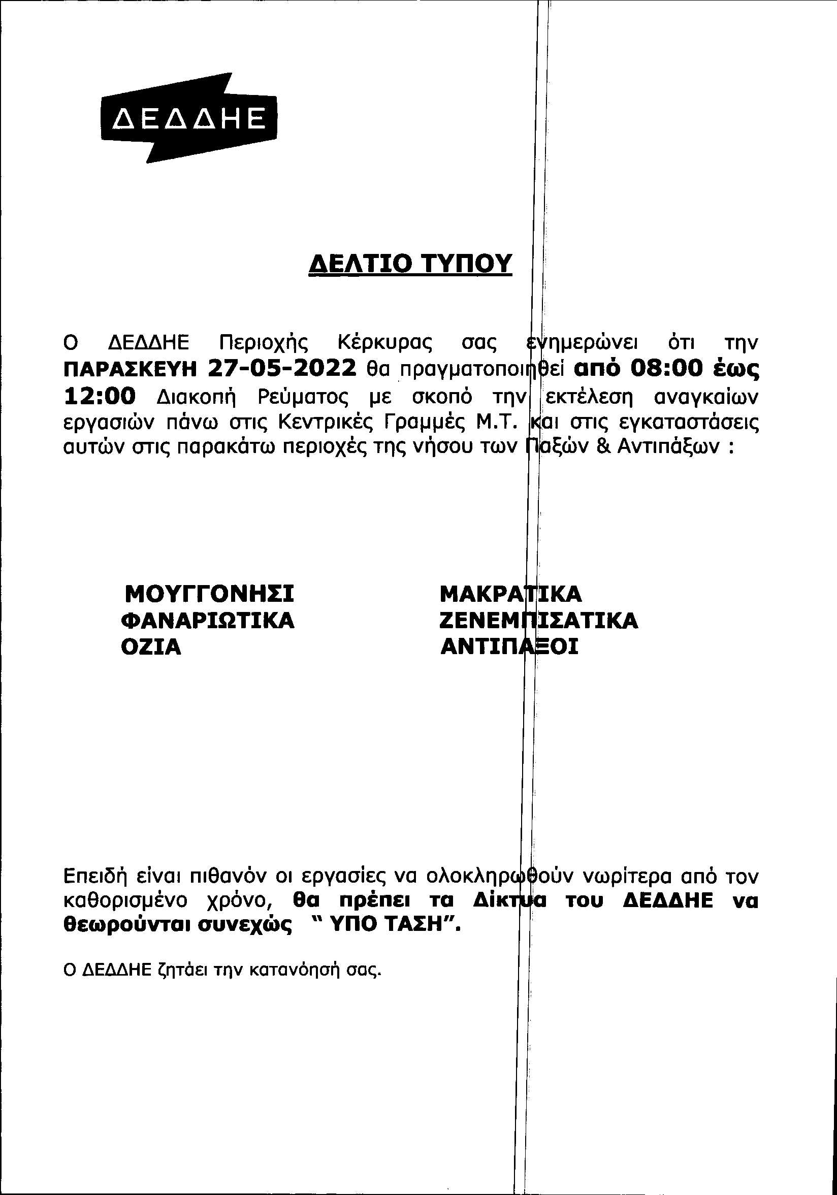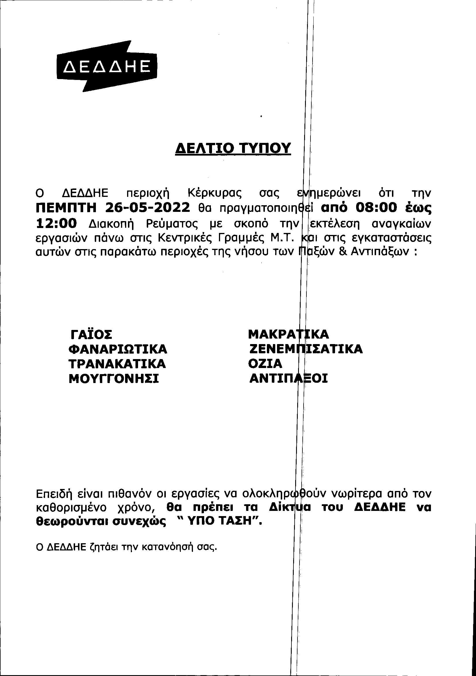 Την Πέμπτη πρωί και απόγευμα και την Παρασκευή το πρωί θα υπάρξουν διακοπές ρεύματος σε περιοχές των Παξών και στους Αντιπάξους λόγω εργασιών.