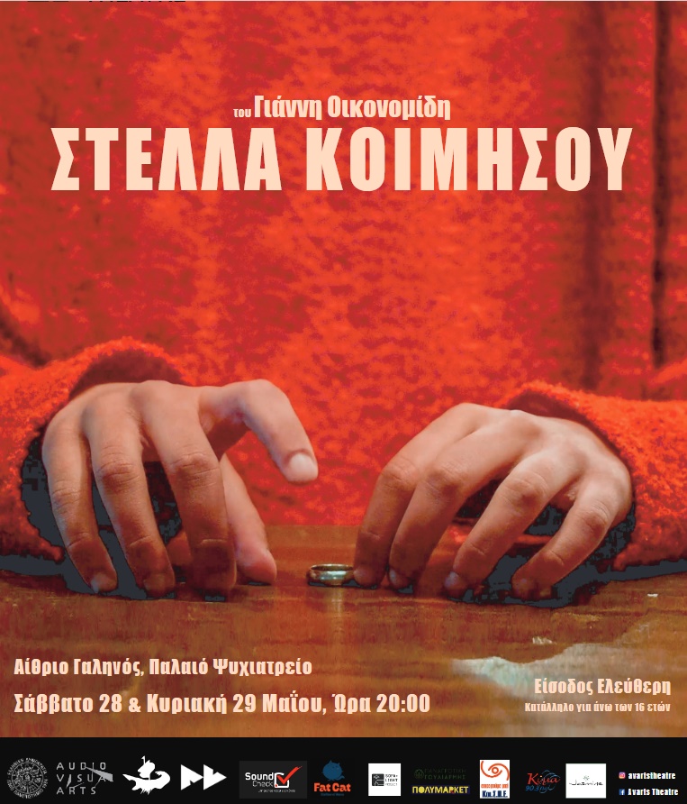 Η φοιτητική θεατρική ομάδα Avarts Theatre, στα πλαίσια του 15ου Φεστιβάλ Οπτικοακουστικών Τεχνών, του τμήματος Τεχνών Ήχου και Εικόνας του Ιονίου Πανεπιστημίου, ανεβάζει το Σάββατο 28 και την Κυριακή 29 Μαΐου το έργο, «Στέλλα κοιμήσου» του Γιάννη Οικονομίδη. Αίθριο του Ασκληπιού, του παλαιού Ψυχιατρείου, ώρα 20:00.