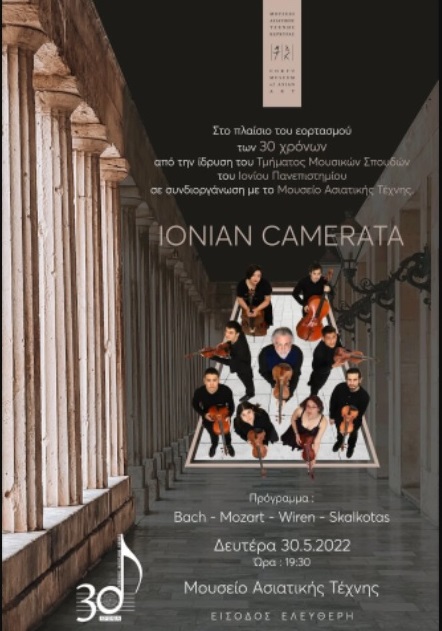 Στο πλαίσιο του εορτασμού των 30 χρόνων του Τμήματος Μουσικών Σπουδών του Ιονίου Πανεπιστημίου, θα πραγματοποιηθεί συναυλία με την «Ionian Camerata» του Τμήματος Μουσικών Σπουδών Ιονίου Πανεπιστημίου στο Μουσείο Ασιατικής Τέχνης Κέρκυρας τη Δευτέρα, 30 Μαΐου, στις 19:30.