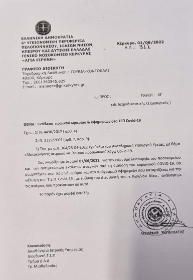 Πρόγραμμα εφημεριών Τ.Ε.Π COVID Γενικού Νοσοκομείου Κέρκυρας