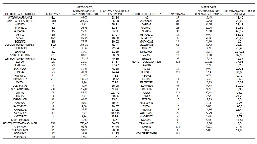 Αναλυτικά, η διασπορά των νέων κρουσμάτων ανά περιφερειακή ενότητα