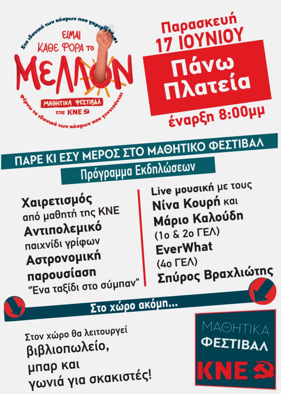 Με αυτό το σύνθημα, διεξάγονται και φέτος σε όλη τη χώρα, τα Μαθητικά Φεστιβάλ και εκδηλώσεις της ΚΝΕ, που έχουν μετατραπεί στο μεγάλο ραντεβού των μαθητών! Αποτελώντας βήμα συζήτησης , προβληματισμού, έκφρασης και καλλιτεχνικής δημιουργίας για χιλιάδες μαθητές σε όλη την χώρα συνεχίζουμε και φέτος.