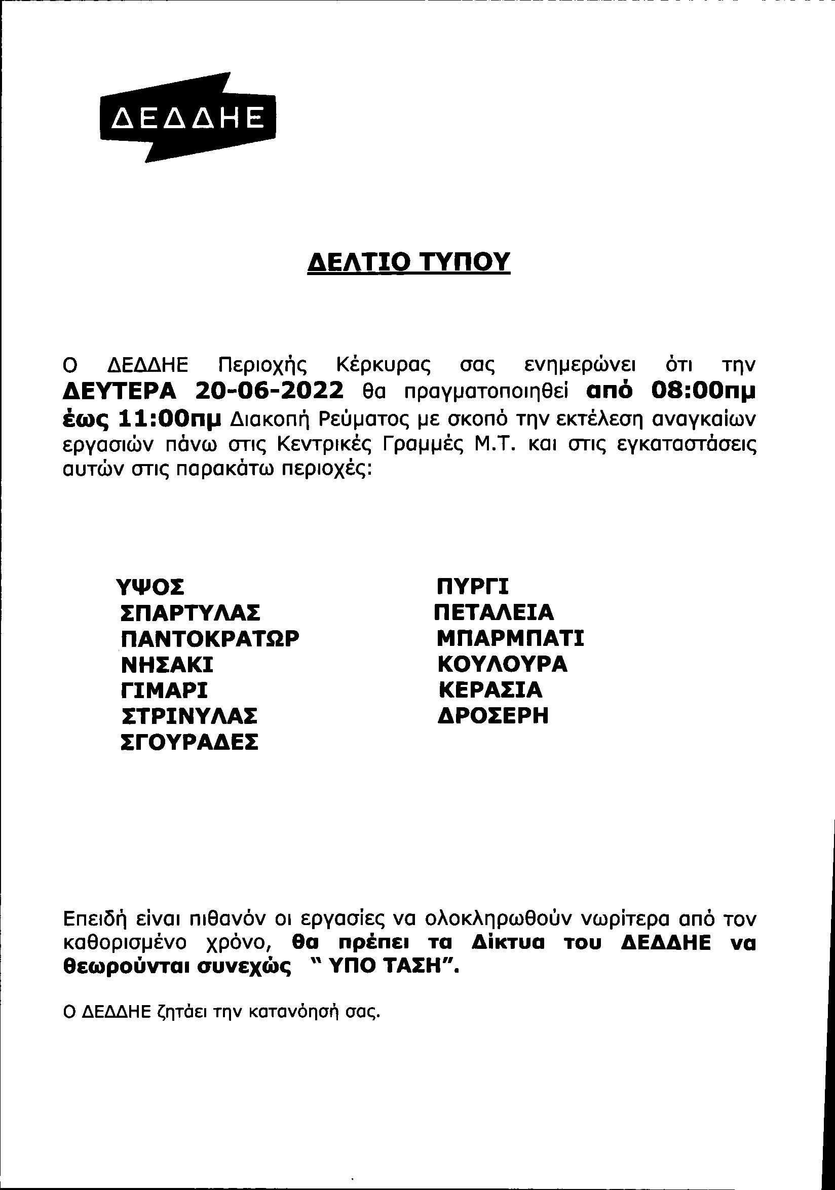 ΚΟΙΝΩΝΙΑΕΛΕΥΘΕΡΟΕΙΔΗΣΕΙΣ Τρίωρη διακοπή ρεύματος σε πολλές περιοχές την Δευτέρα Αιτία της διακοπής θα είναι οι εργασίες που θα πραγματοποιήσει ο ΔΕΔΔΗΕ. Last updated: 17/06/2022 12:04 CorfuPress.com Published: 17/06/2022 Share SHARE Αιτία της διακοπής θα είναι οι εργασίες που θα πραγματοποιήσει ο ΔΕΔΔΗΕ. Διακοπή ρεύματος τη Δευτέρα-Δείτε που Που θα γίνει διακοπή ρεύματος την Τετάρτη Που θα γίνει διακοπή ρεύματος την Τετάρτη Επιστολή Επιμελητηρίου προς ΔΕΔΔΗΕ για τις πολύωρες διακοπές ρεύματος Που θα γίνουν προγραμματισμένες διακοπές ρεύματος το διάστημα 23-25 Αυγούστου Share This Article Facebook Whatsapp Whatsapp Email Copy Link Print Previous Article «Η Αρχή της Μεσης Γραμμής στο Δίκαιο της Θάλασσας» παρουσιάζεται στο Δικαστικό Μέγαρο Next Article Μπιάγκης: Σε κίνδυνο η Σχολή Ξεναγών Κέρκυρας Δεν υπάρχουν Σχόλια Δεν υπάρχουν Σχόλια Αφήστε μια απάντηση Ακύρωση απάντησηςΗ ηλ. διεύθυνση σας δεν δημοσιεύεται. Τα υποχρεωτικά πεδία σημειώνονται με *Σχόλιο * Όνομα * Email * Ιστότοπος Αποθήκευσε το όνομά μου, email, και τον ιστότοπο μου σε αυτόν τον πλοηγό για την επόμενη φορά που θα σχολιάσω. ΑναζήτησηΑναζήτησηRecent PostsΌλα τα μάτια στον Θοδωρή, τον καπετάνιο μας! Τη Δευτέρα 22 Σεπτεμβρίου γιορτάζει… Σαν Σήμερα 22/9: Τα σημαντικότερα γεγονότα… Η πρόγνωση του καιρού Έφηβοι Ιονίου: Με περίπατο, συνεχίζουν στο Rising Stars! Recent CommentsΧωρίς σχόλια για εμφάνιση.