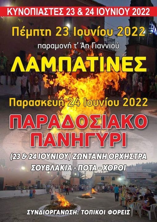 Λαμπατίνες ή Λάμπατα το έθιμο που καλά κρατεί σε αρκετά μέρη στην Κέρκυρα. Στο Ζυγό τα Λάμπατα θα γιορταστούν το Σάββατο 25 Ιουνίου με παραδοσιακή μουσική από την ορχήστρα Φαίακες. Ώρα έναρξης 21:00