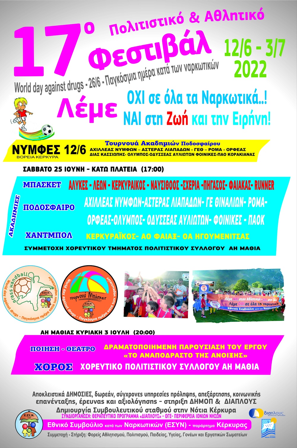 Με αφορμή την παγκόσμια ημέρα κατά των ναρκωτικών (26 Ιουνίου) το παράρτημα Κέρκυρας του Εθνικού Συμβουλίου κατά των Ναρκωτικών διοργανώνει και φέτος εκδηλώσεις ευαισθητοποίησης και ενημέρωσης. Πρόκειται για το 17ο φεστιβάλ του.