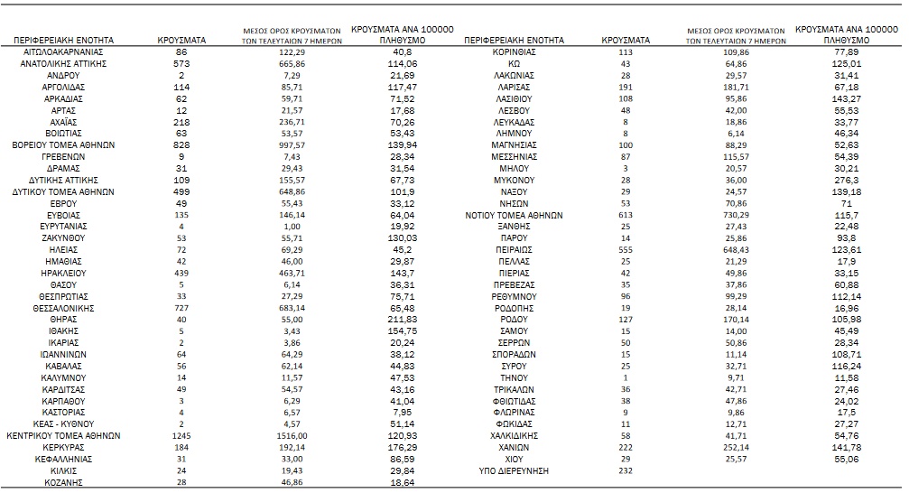 Αναλυτικά, η διασπορά των νέων κρουσμάτων ανά περιφερειακή ενότητα: