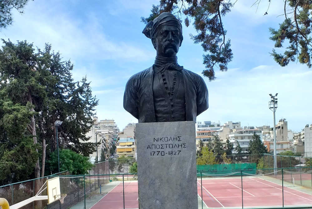 Στην απέναντι πλευρά του δρόμου, είναι τοποθετημένη πρώτη σε σειρά, η προτομή του Νικολή Αποστόλη (1770-1827), ναυμάχου του 1821 και αρχηγού του στόλου των Ψαριανών. Με διαστάσεις ελαφρά μεγαλύτερες του φυσικού, η προτομή καλύπτει όλο το μπούστο, τέμνεται οριζόντια στη μέση του κορμού και έχει τους βραχίονες σε λοξή απότμηση μόλις πάνω από τον αγκώνα. Εδράζεται σε λιτή μαρμάρινη στήλη, στην πρόσοψη της οποίας αναγράφονται τα στοιχεία της ταυτότητας του τιμώμενου.