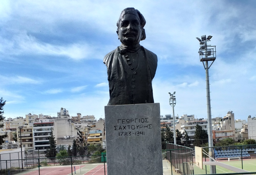 Λίγο πιο κει, στην ίδια ευθεία, είναι στημένη η προτομή του Γεωργίου Σαχτούρη (1783-1841), αντιναυάρχου της Ύδρας. Η προτομή εκτείνεται σε μεγάλο μέρος του μπούστου και δεν φέρει βραχίονες. Αν και το κεφάλι της μορφής είναι μεγάλο, οι ώμοι και ο κορμός της είναι δυσανάλογα πολύ στενοί, με απόρροια το έργο να αποκτά ένα στενόμακρο σχήμα και να τονίζεται η ιδέα της καθετότητας. Αυτό σε μια ¨θέληση ίσως του γλύπτη να εστιάσει και να τονίσει έτσι τα στοιχεία που εναρμονίζουν τη μορφή με τη ναυτική της ιδιότητα. Τα φυσιογνωμικά χαρακτηριστικά του προσώπου αποδίδονται, με τη σειρά τους, με ήπιο και συμμετρικό τρόπο, καθώς και με απόλυτη ρεαλιστική συνέπεια, όπως φαίνεται από το ζωγραφικό πορτραίτο του ήρωα, που υπάρχει στο Εθνικό Ιστορικό Μουσείο, από το οποίο άλλωστε, σύμφωνα με τα λόγια του, εμπνεύστηκε ο δημιουργός το παρόν δικό του. Ωστόσο, το βλέμμα του θεατή κλέβει το χαμόγελο του ναυμάχου και η ευχάριστη και χαρωπή όψη που του προσδίδει, τον κάνει αβίαστα συμπαθή στον θεατή.