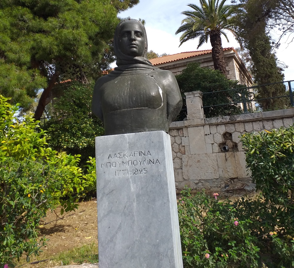 Η περιήγηση αρχίζει από τη δεξιά πλευρά όπου συναντούμε πρώτη στη σειρά την προτομή της Λασκαρίνας – Μπουμπουλίνας (Σπέτσες 1771-1828), φιλοτεχνημένη από το γλύπτη Μιχάλη Παπαδάκη (1944-2020). Το γλυπτό φέρει διαστάσεις μεγαλύτερες του συμβατού (0,90 μ. ύψος) και εδράζεται απευθείας στη στήλη χωρίς τη μεσολάβηση βάσης. Στην πρόσοψη της στήλης, υπάρχουν εγχάρακτες επιγραφές με κεφαλαία γράμματα, που πληροφορούν σχετικά με την ταυτότητα της εικονιζόμενης προσωπικότητας, καθώς και τη χρονολογία της γέννησης και του θανάτου της,