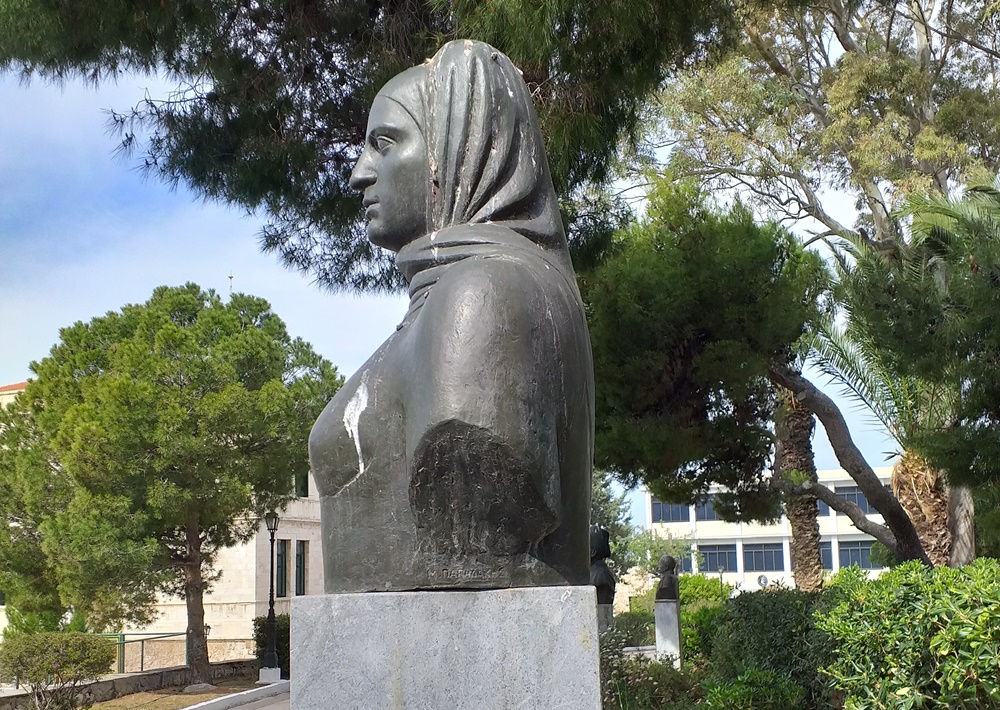 Εν τούτοις, είναι το πρόσωπό της, το οποίο, αποδομένο με κολακευτική διάθεση, που τείνει στην εξιδανίκευση και την ωραιοποίηση, διεκδικεί δικαίως το αμέριστο ενδιαφέρον του θεατή. Εντυπωσιάζει το υπέροχο οβάλ σχήμα του προσώπου και οι παντελώς αρυτίδωτες επιφάνειες, όπου σμιλεύονται με περίσσεια λεπτότητα τα ατομικά φυσιογνωμικά χαρακτηριστικά· το ευρύ, καθαρό μέτωπο, η ίσια λεπτή μύτη, τα όμορφα αμυγδαλωτά μάτια, τα μετριοπαθώς τονισμένα ζυγωματικά,το καλογραμμένο στόμα. Μέσα από τη συγκεκριμένη διαχείριση, το σοβαρό και στοχαστικό αυτό πρόσωπο αποκτά επιπλέον μια ευγενή και μειλίχια έκφραση, που αφοπλίζει το θεατή, παραπέμποντας σε απεικονίσεις της Παναγίας, ειδικότερα μιας αναγεννησιακής Μαντόνα. Παράλληλα, η εν γένει όψη της αποπνέει την παλικαριά και την αποφασιστικότητα που συνάδουν απόλυτα με την αγωνιστική της ιδιοσυγκρασία και το ρόλο που διαδραμάτισε στον Αγώνα.