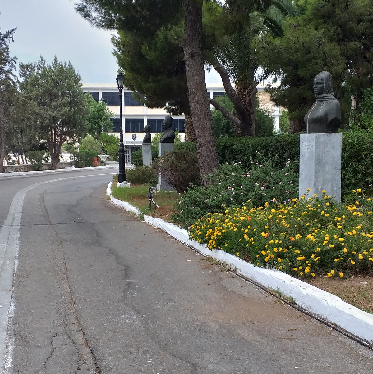 Ο πρώτος δρόμος, που συναντά ο επισκέπτης διαβαίνοντας την κεντρική πύλη της Σχολής Ναυτικών Δοκίμων, φέρει την ονομασία οδός Αιγαίου. Ο όμορφος και ευρύς αυτός δρόμος αποκτά μια ιδιαίτερη ιστορική και συνάμα καλλιτεχνική αξία, από το 1990, όταν πλαισιώνεται εκατέρωθεν και σε όλο σχεδόν το μήκος του από πέντε προτομές, τρεις στη δεξιά πλευρά και δύο στην αριστερή, προς το μέρος της θάλασσας. Τοποθετημένες παρατακτικά, σε μικρή ισομετρική απόσταση μεταξύ τους και πάνω σε ομοιόμορφες ορθογώνιες στήλες (1,40 μ. ύψος Χ 0,40 μ. πλάτος έκαστης πλευράς) με επένδυση λευκού μαρμάρου, οι εν λόγω προτομές παραπέμπουν στα αρχαιοελληνικά καθιστά λιοντάρια, που συνήθως κοσμούσαν ως φύλακες είτε εισόδους πόλεων, είτε οδούς προς ιερά, αλλά και στις κεφαλές θεών, βασιλιάδων, αυτοκρατόρων, που στήνονταν στις κεντρικές οδούς με δοξαστική και αποθεωτική πρόθεση.